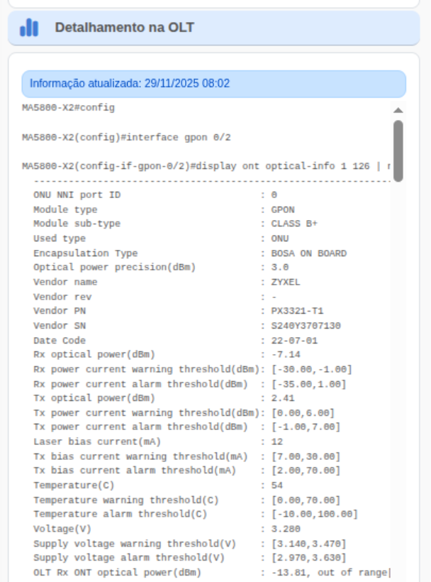 Esses dados ajudam a equipe a identificar defeito no SFP ou comportamento anormal da porta PON.