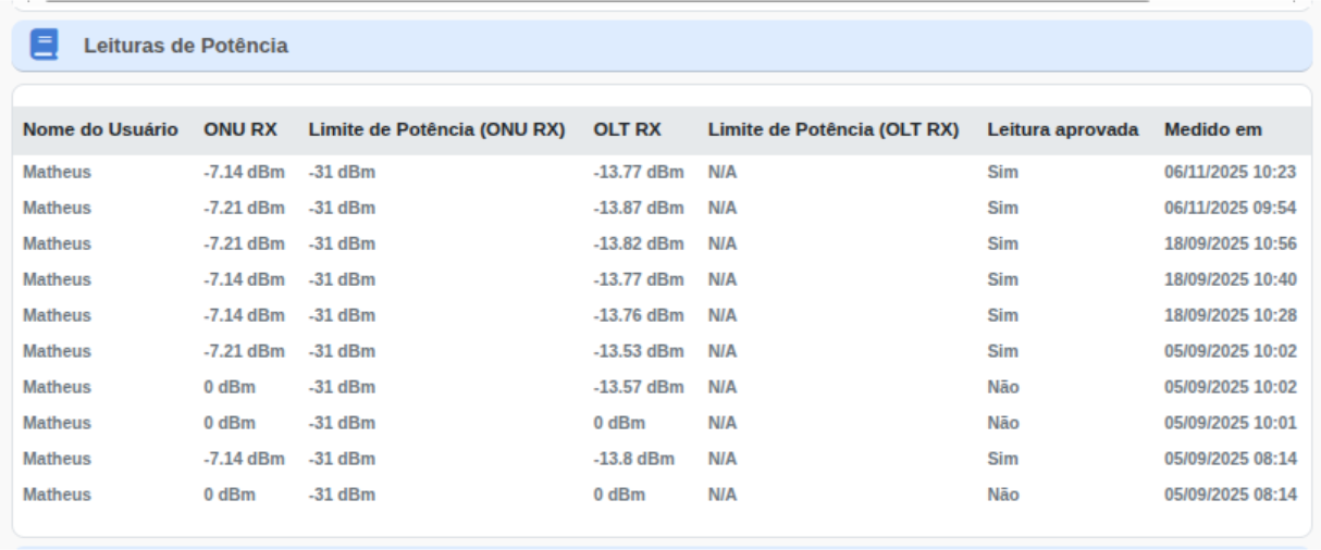 O quadro Leituras de Potência apresenta o histórico das últimas medições ópticas tanto da ONU quanto da OLT, permitindo avaliar a estabilidade do sinal ao longo do tempo.