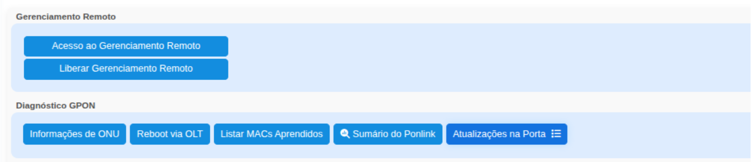 Esses botões aceleram o atendimento do suporte, evitando navegação entre telas e permitindo ações diretas na ONU/OLT.